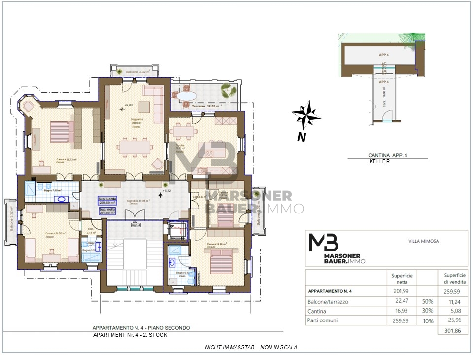 - Herrschaftliche Wohnung Apartment Nr. 4 im 2. Stock mit einer Nettofläche von ca. 201 m², bestehend aus Eingangshalle, 4 Zimmer (darunter 1 charaktervolles Erkerzimmer), Wohnraum, Küche mit anliegender Terrasse, 3 Bäder und 3 Balkone;