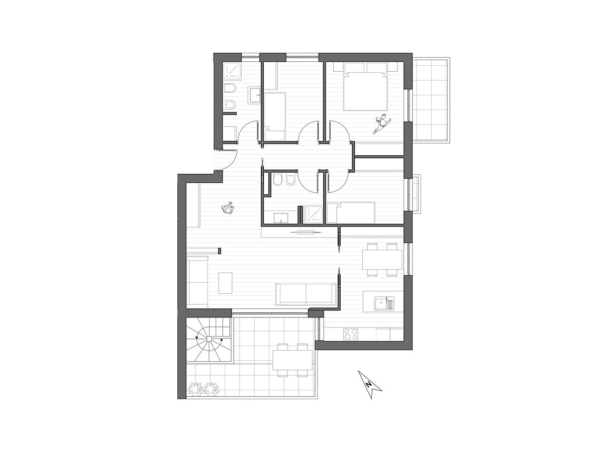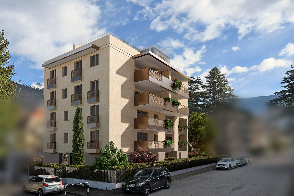 "Dieses moderne, gut geschnittene Penthouse befindet sich im dritten Obergeschoss eines hochwertigen Neubaus in Meran. Es überzeugt durch ein durchdachtes Raumkonzept mit klarer Trennung zwischen Wohn- und Schlafbereich. Der großzügige Wohnraum mit integrierter Küche öffnet sich zur sonnigen Südterrasse und schafft ein angenehmes Wohngefühl mit viel Tageslicht. Das Schlafzimmer ist ruhig gelegen und bietet ausreichend Platz für Stauraum. Zwei Bäder – eines mit Fenster und Dusche, das andere als Gäste-WC – erhöhen den Wohnkomfort zusätzlich. Ein Abstellraum mit Waschmaschinenanschluss ist ebenfalls vorhanden. Das Penthouse ist bequem per Aufzug erreichbar und liegt in zentrumsnaher und krankenhausnaher Lage mit guter Anbindung an öffentliche Verkehrsmittel und Einkaufsmöglichkeiten. Der Neubau wurde nach dem Standard eines Klimahauses A Nature errichtet. Garagen sind gegen Aufpreis erhältlich, und da es sich um einen Neubau handelt, können persönliche Wünsche bei der Innenausstattung berücksichtigt und das Innere individuell gestaltet werden.