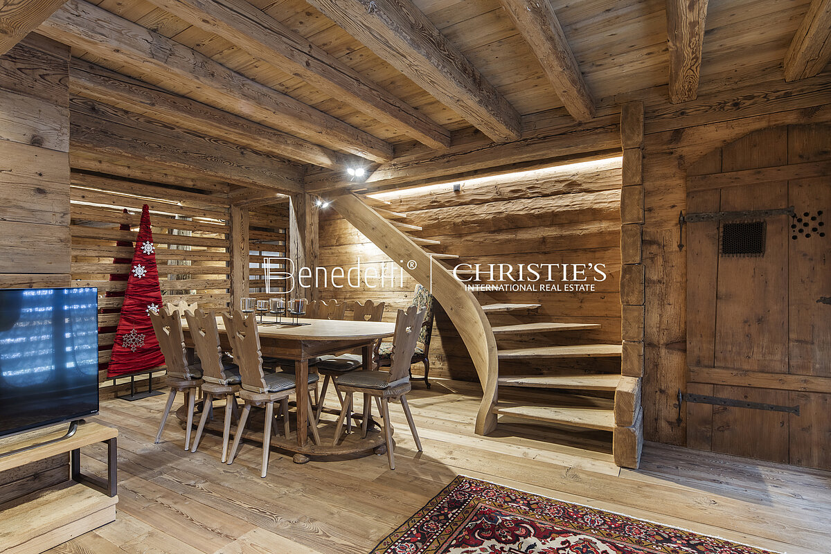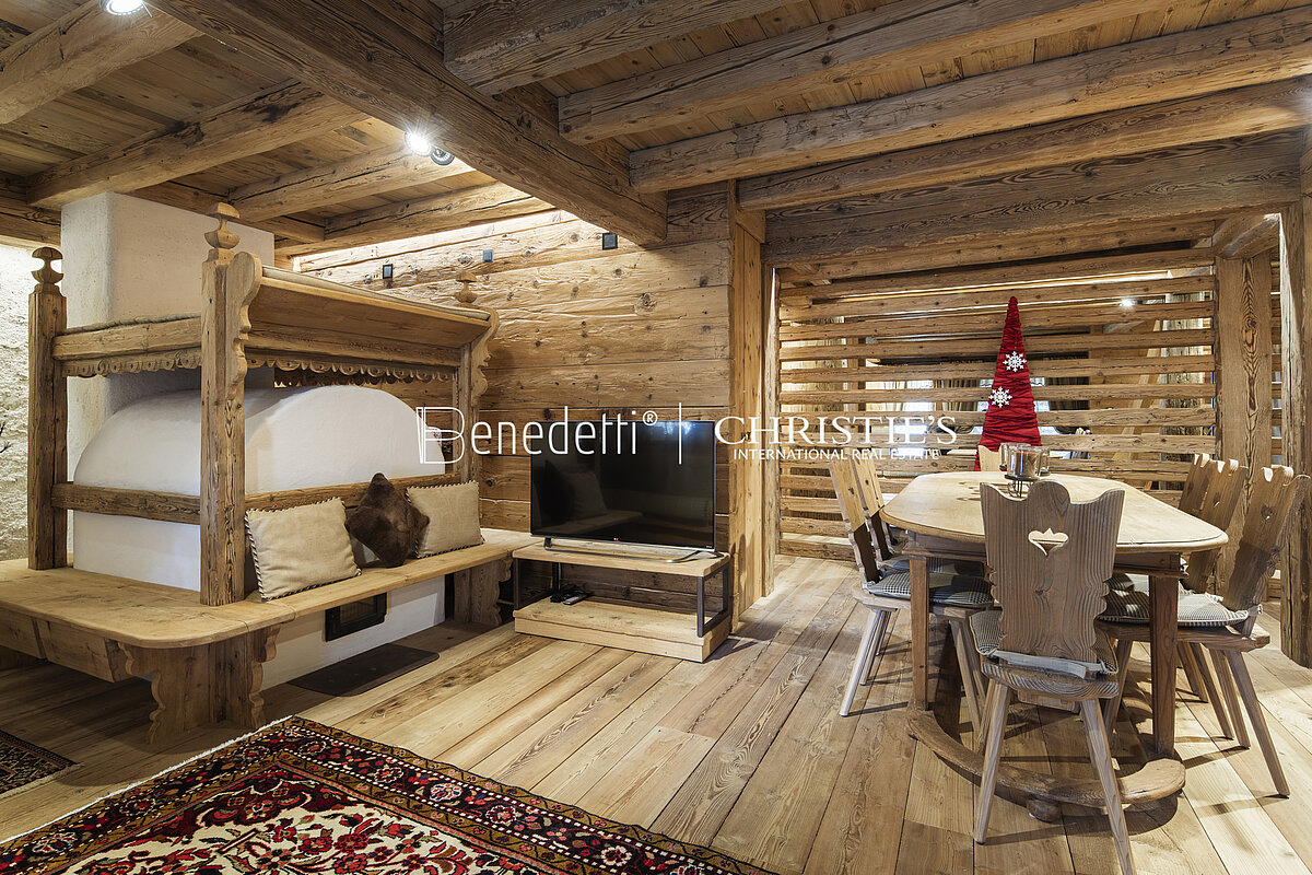 In einem typischen ampezzanischen Wohnhaus, im malerischen Ortsteil Alverà in Cortina d'Ampezzo, steht diese wunderschöne Luxuswohnung zum Verkauf. Sie ist im charakteristischen Alpenstil eingerichtet und verfügt über eine eigene Garage.
