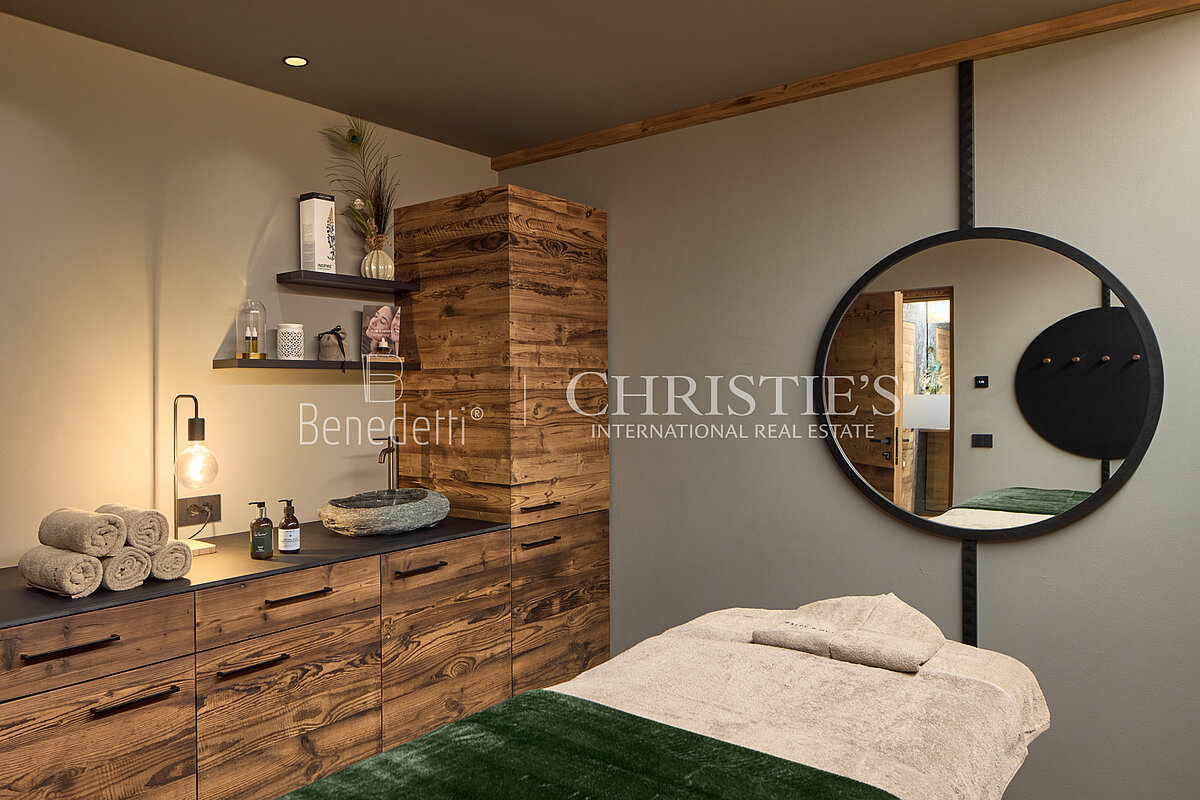 Ein besonderes Highlight der Immobilie ist der exklusive private Wellnessbereich, konzipiert als eine echte Spa-Oase: ein voll ausgestatteter Fitnessraum, finnische Sauna, Dampfbad, Schneedusche, Erlebnisdusche, ein separater Ruhebereich sowie ein Massageraum sorgen für ein ganzheitliches Wohlfühlerlebnis nach einem Tag auf der Skipiste oder in der Natur.