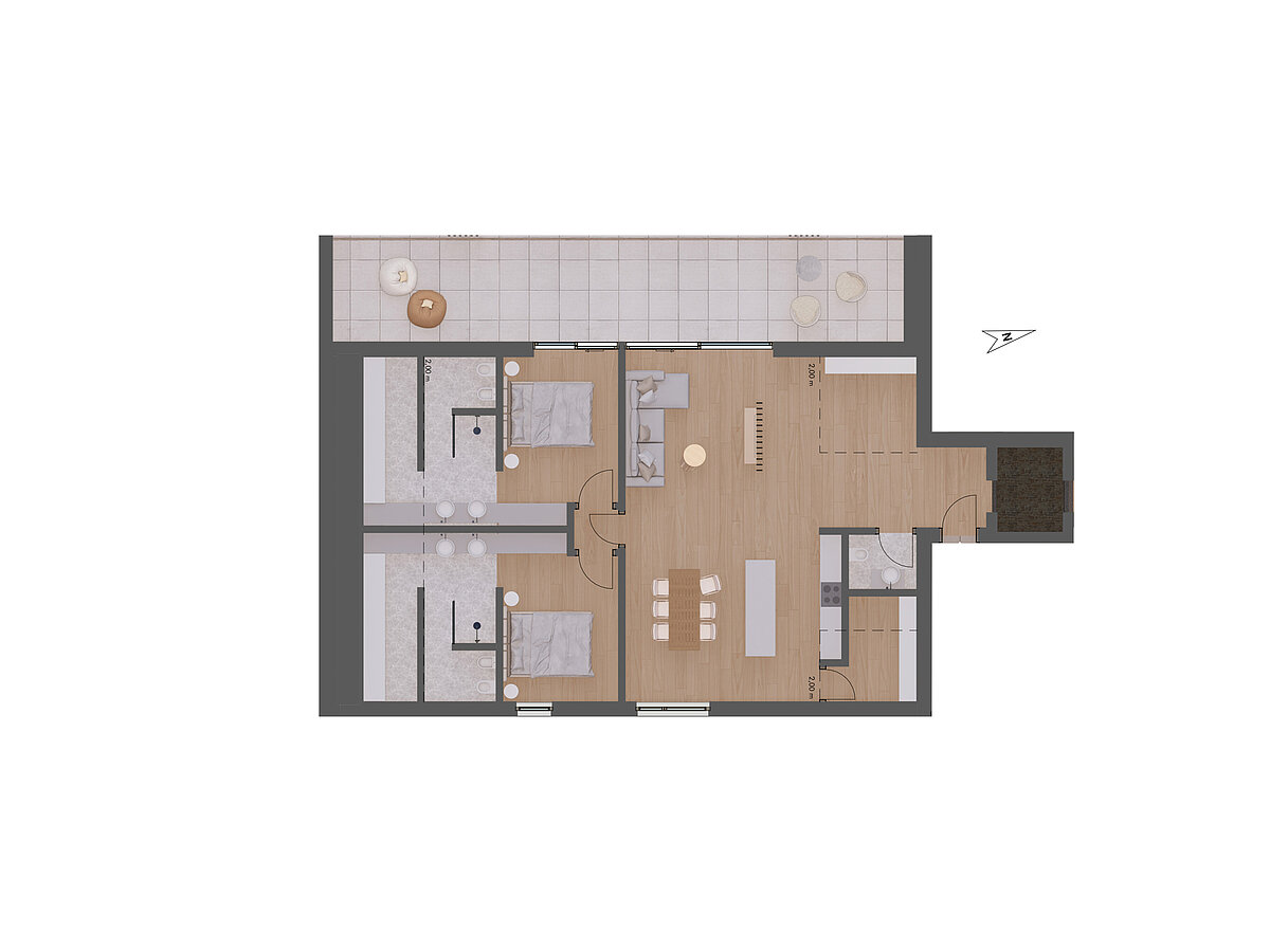 Dieses Penthouse in Meran/Obermais verbindet moderne Architektur mit einer außergewöhnlich offenen Wohnatmosphäre. Der großzügige Wohn- und Essbereich ist von weitläufigen Glasfronten geprägt, die eindrucksvolle Ausblicke über die umliegende Landschaft ermöglichen und die Räume mit natürlichem Licht durchfluten. Die große Terrasse erweitert den Wohnraum nach außen und bietet ein exklusives Panorama. Zwei Schlafzimmer sowie zwei hochwertig ausgestattete Badezimmer formen eine klare, komfortable Raumstruktur. Die Ausführung im Klimahaus A-nature-Standard, inklusive dreifach verglaster Holz-Alu-Fenster, Fußbodenheizung mit Kühlfunktion, dezentraler Wohnraumlüftung und Photovoltaikanlage, sorgt für energieeffizienten Wohnkomfort. Die Kombination aus luxuriöser Aussicht, großzügigen Glasflächen und nachhaltiger Bauweise verleiht diesem Penthouse eine besonders repräsentative Note. Eine Einzelgarage ist für 44.000€ und eine Doppelgarage für 88.000€ zusätzlich erhältlich.