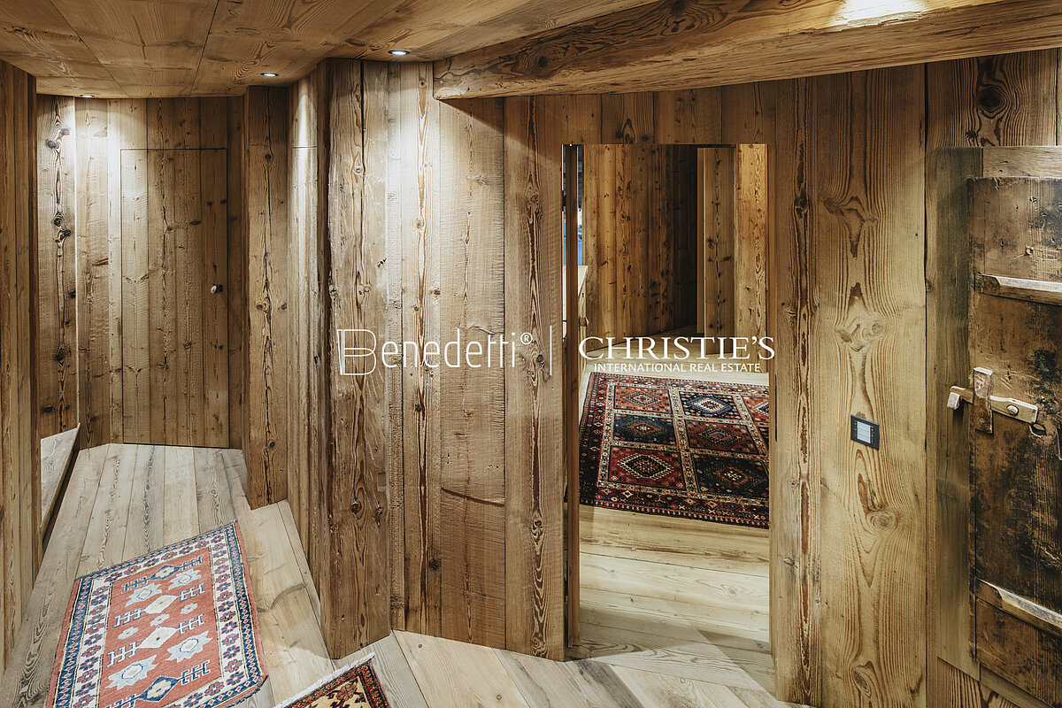 Nicht weit vom berühmten Corso Italia, der Einkaufsstraße und dem Herzen des gesellschaftlichen Lebens von Cortina, entfernt, befindet sich die Wohnung mit einer Fläche von 170 Quadratmetern auf zwei Stockwerken eines typischen Bergchalets.