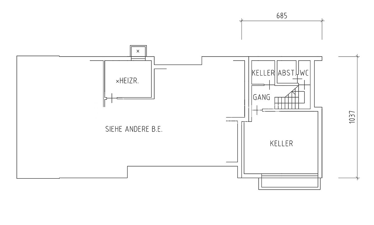 Untergeschoss: zwei Kellerräume, ein Abstellraum, separates WC sowie ein zentraler Gang mit Treppe in die oberen Etagen