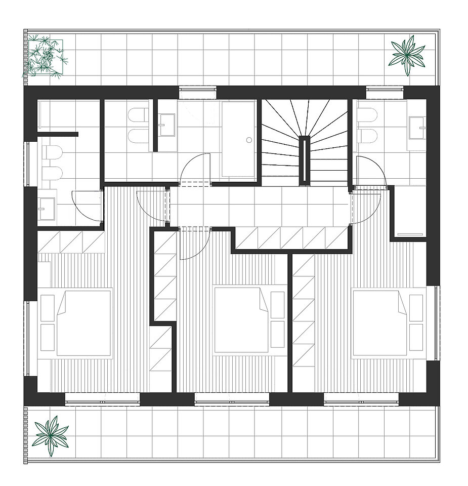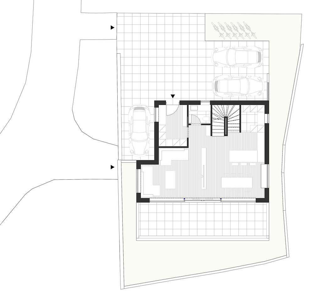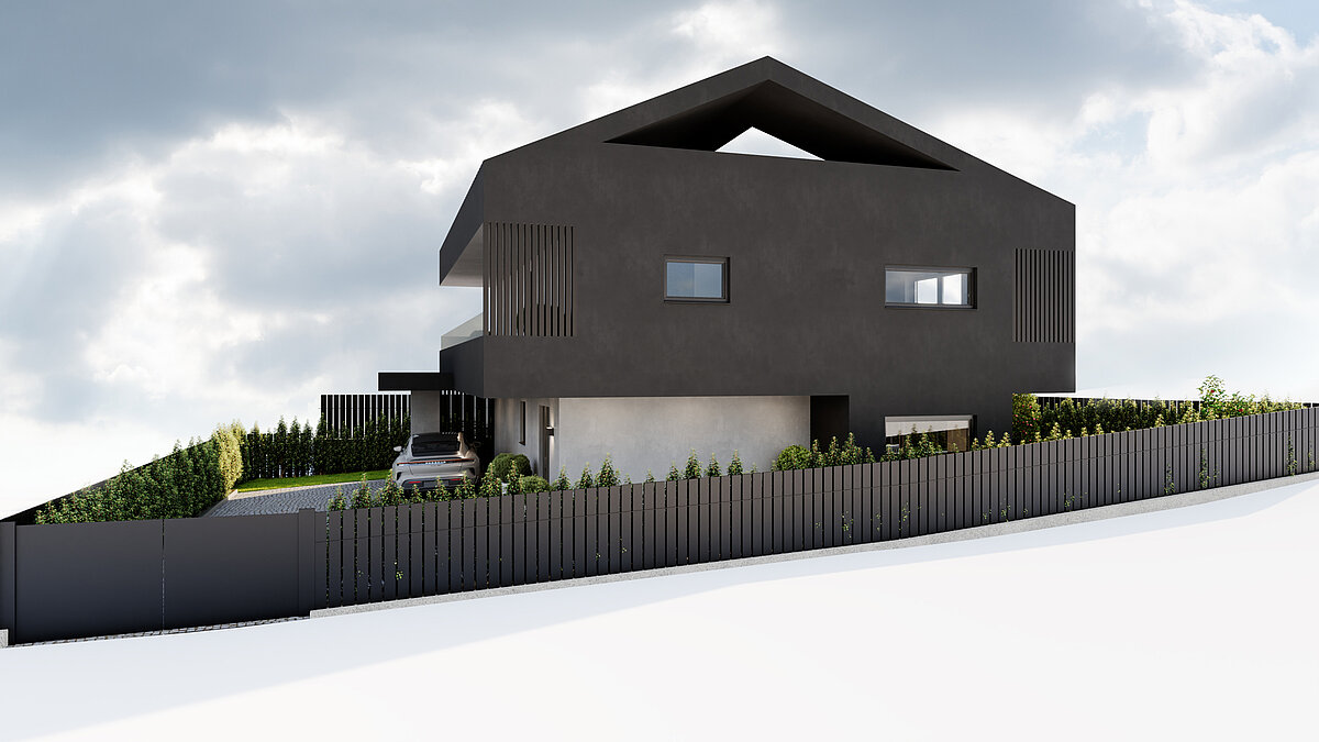 Die exklusive Villa überzeugt durch moderne Architektur mit klaren Linien, großzügigen Fensterflächen und einem markanten Satteldach. Die hochwertige Immobilie erstreckt sich über mehrere Ebenen und bietet ein durchdachtes Raumkonzept: Wohn- und Essbereich im Erdgeschoss, drei Schlafzimmer mit jeweils eigenem Bad im Obergeschoss sowie eine großzügige Dachterrasse im zweiten Obergeschoss. Ein Carport und private Außenbereiche sorgen für zusätzlichen Komfort und Privatsphäre.