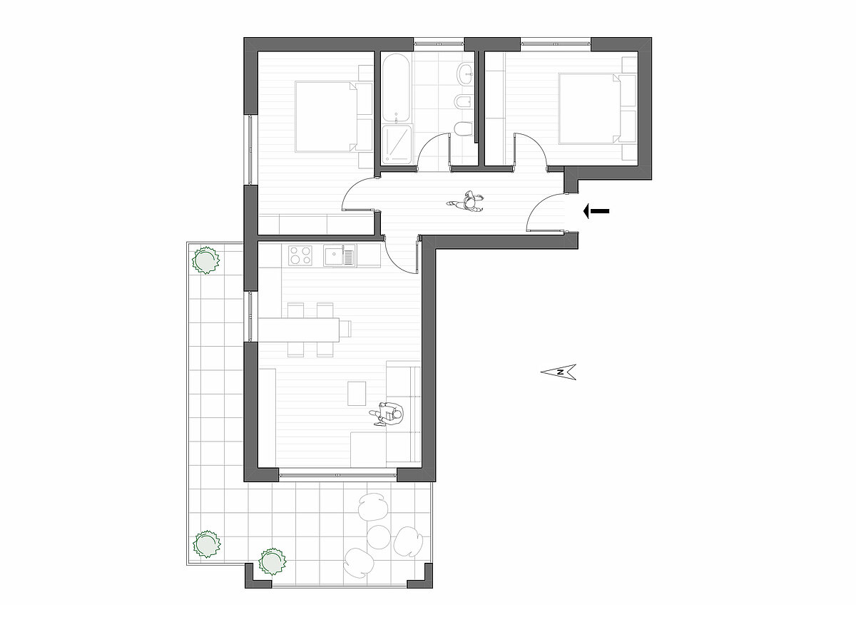 Die komplett möblierte Wohnung verfügt über ein helles Wohnzimmer mit offener Küche, ein großzügiges Schlafzimmer, ein weiteres Zimmer sowie ein Badezimmer mit Fenster. Flur, Terrasse und ein Kellerraum ergänzen das attraktive Raumangebot.