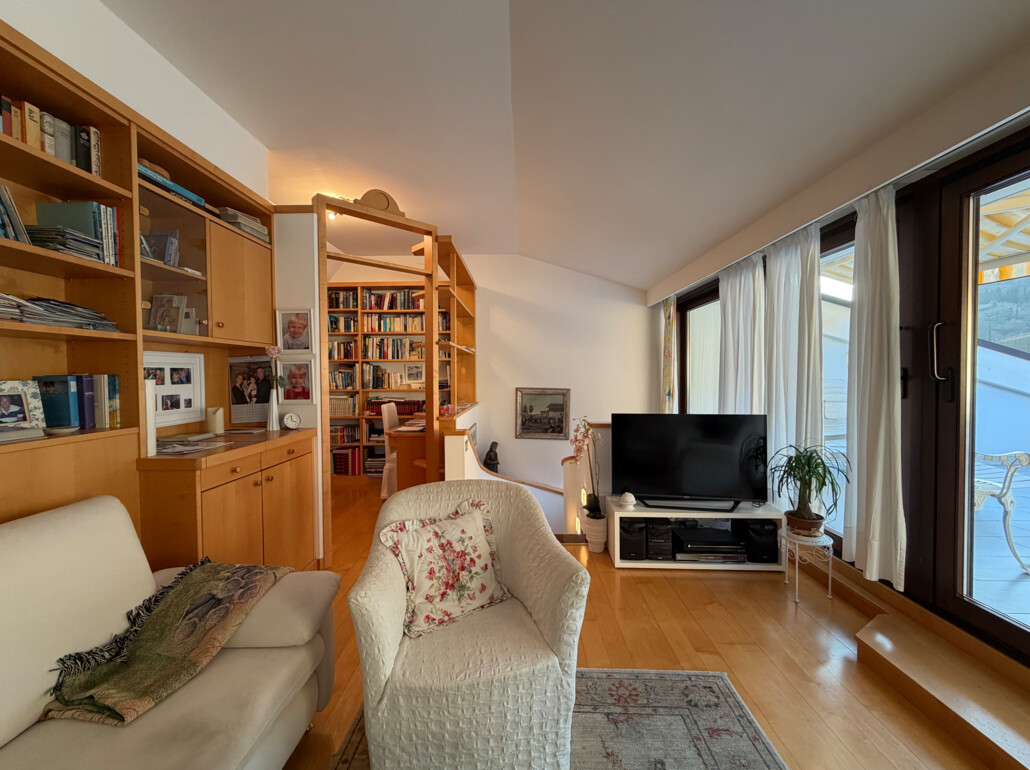Ebene 2: Großzügiger Raum, derzeit als Wohnzimmer genutzt, kleine Bibliothek, Waschraum große Dachterrasse