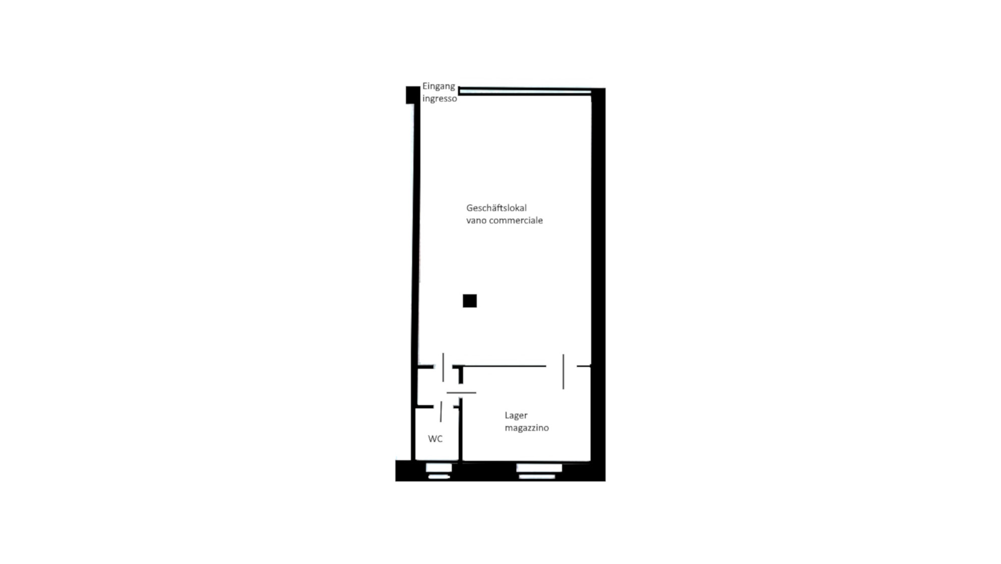 Helles Geschäftslokal im Erdgeschoss mit Schaufenster, geeignet für den Verkauf, Beratung oder Reparatur u.ä., mit kleinem Magazin und WC/Wasseranschluss im hinteren Teil.