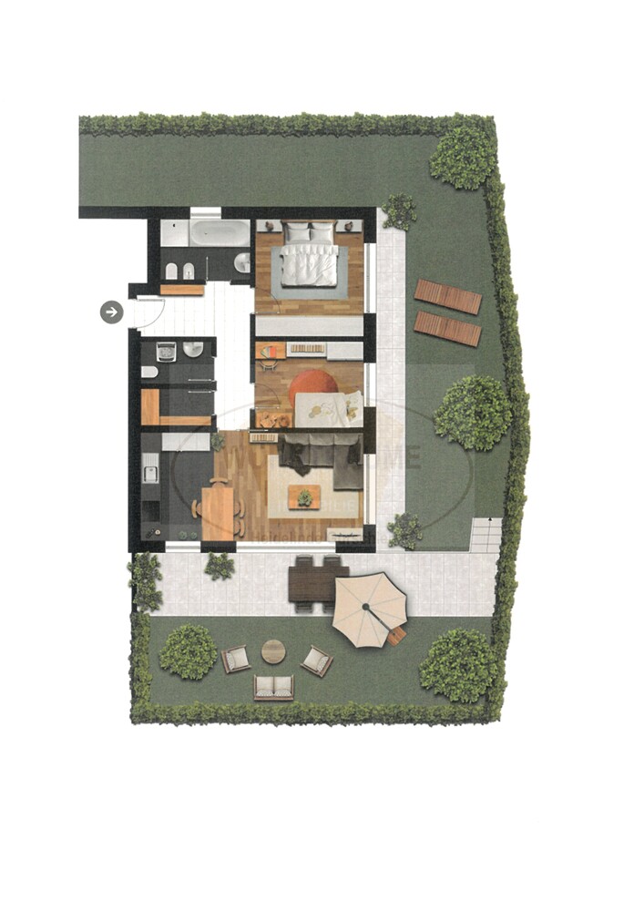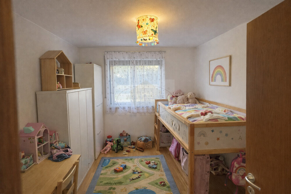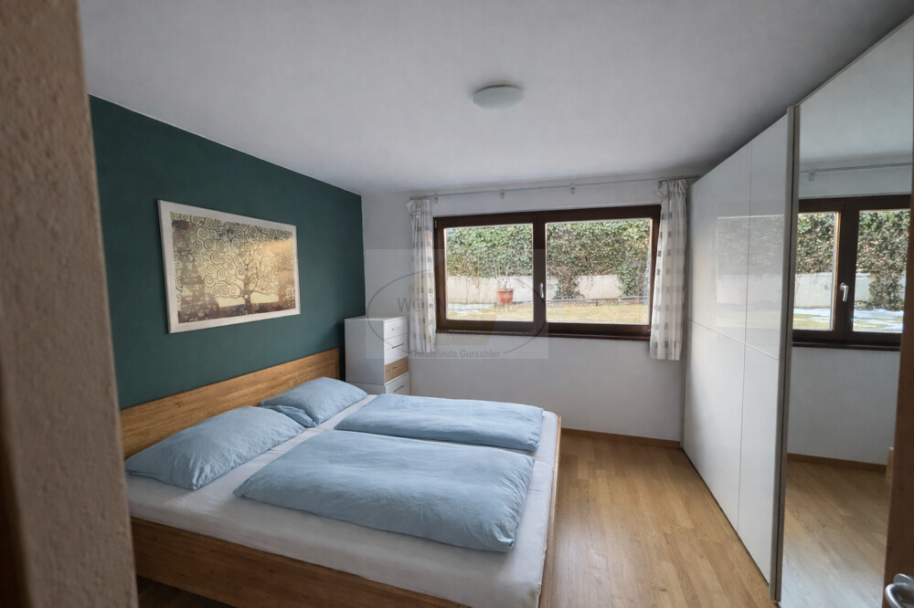 Die Wohneinheit besteht aus Diele, Wohnküche mit Südterrasse und großem umliegenden Garten, zwei Schlafzimmern Badezimmer, Abstellraum, Tages-WC, zwei Kellern und zwei Garagenstellplätzen. Die Wohnung ist für Ansässige bestimmt.