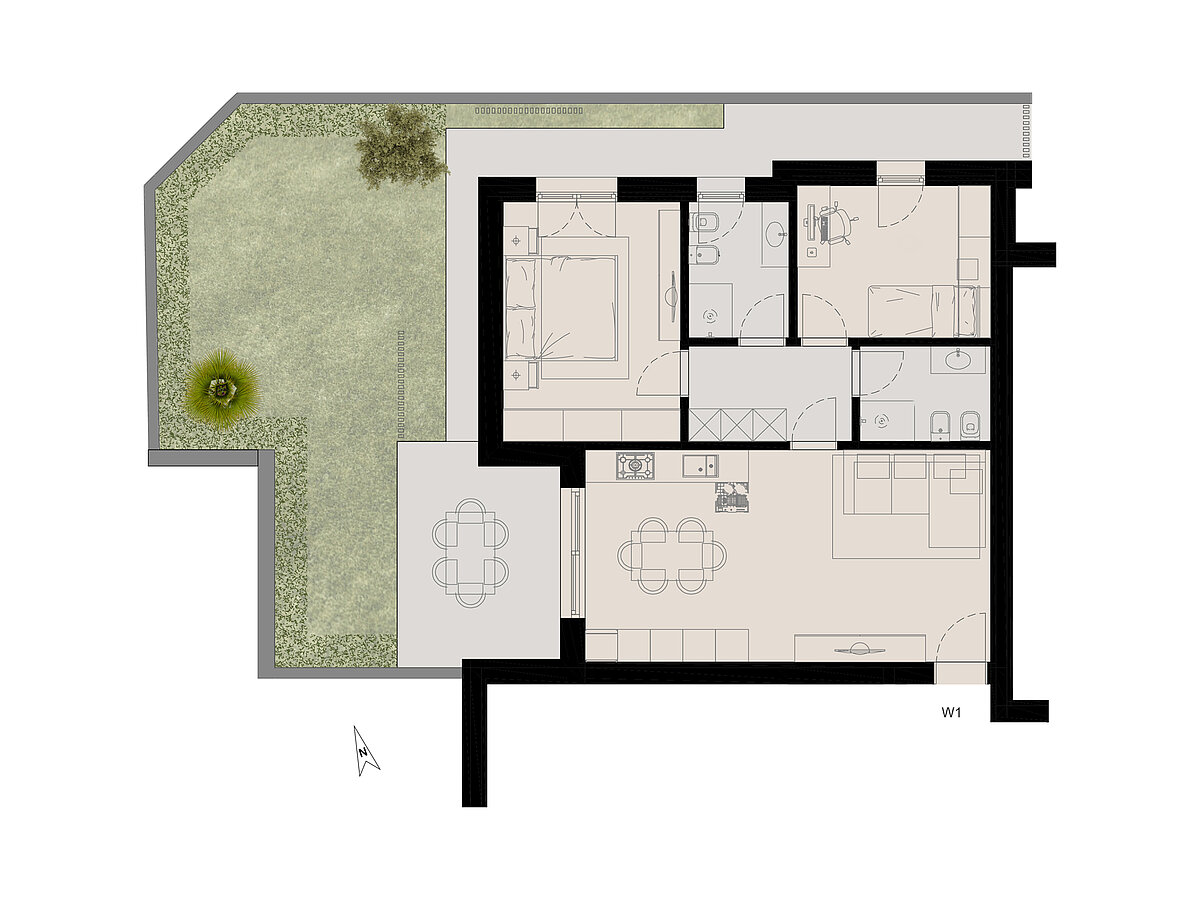 Die Wohnung verfügt über einen großzügigen Wohnbereich mit offener Küche sowie eine große Terrasse mit Garten, ideal für Mahlzeiten im Freien und entspannte Stunden. Es stehen zwei komfortable Schlafzimmer zur Verfügung, ein Doppelzimmer und ein Einzelzimmer, sowie zwei moderne Bäder, die hohen Wohnkomfort bieten.