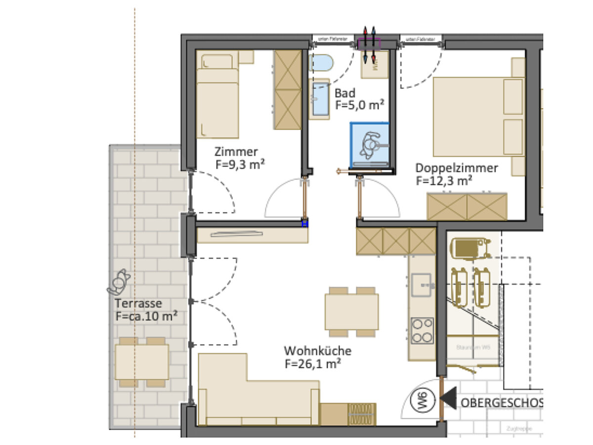 Die Wohnung W6 liegt im ersten Obergeschoss eines modernen Neubaus mit nur sechs exklusiven Wohneinheiten. Der Zugang erfolgt diskret über das Untergeschoss, was ein hohes Maß an Privatsphäre garantiert. Die architektonische Gestaltung verbindet traditionelle Elemente mit moderner Linienführung und fügt sich selbstbewusst in die Umgebung ein. Zur Wohnung gehört eine Terrasse mit ca. 10 m² . Die Grundrissgestaltung schafft ein angenehmes Wohnambiente mit einem offenen Wohn-/Essbereich, einem Doppelzimmer, ein Einzelzimmer und einem modernen Badezimmer. Stellplatz ab €22.000.