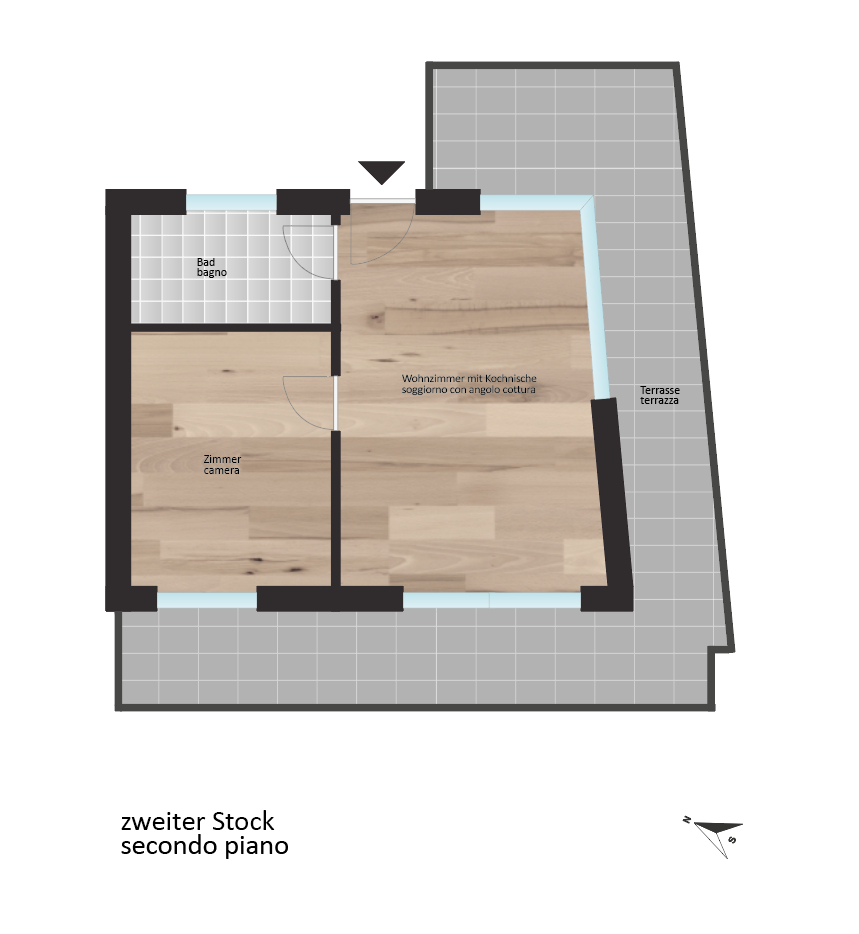 Diese Zweizimmerwohnung im 2.Obergeschoss verfügt über einen gemütlichen Wohnbereich mit Küchenzeile, ein Schlafzimmer und ein modernes Badezimmer. Die großzügige Terrasse lädt zum Genießen der Aussicht ein.