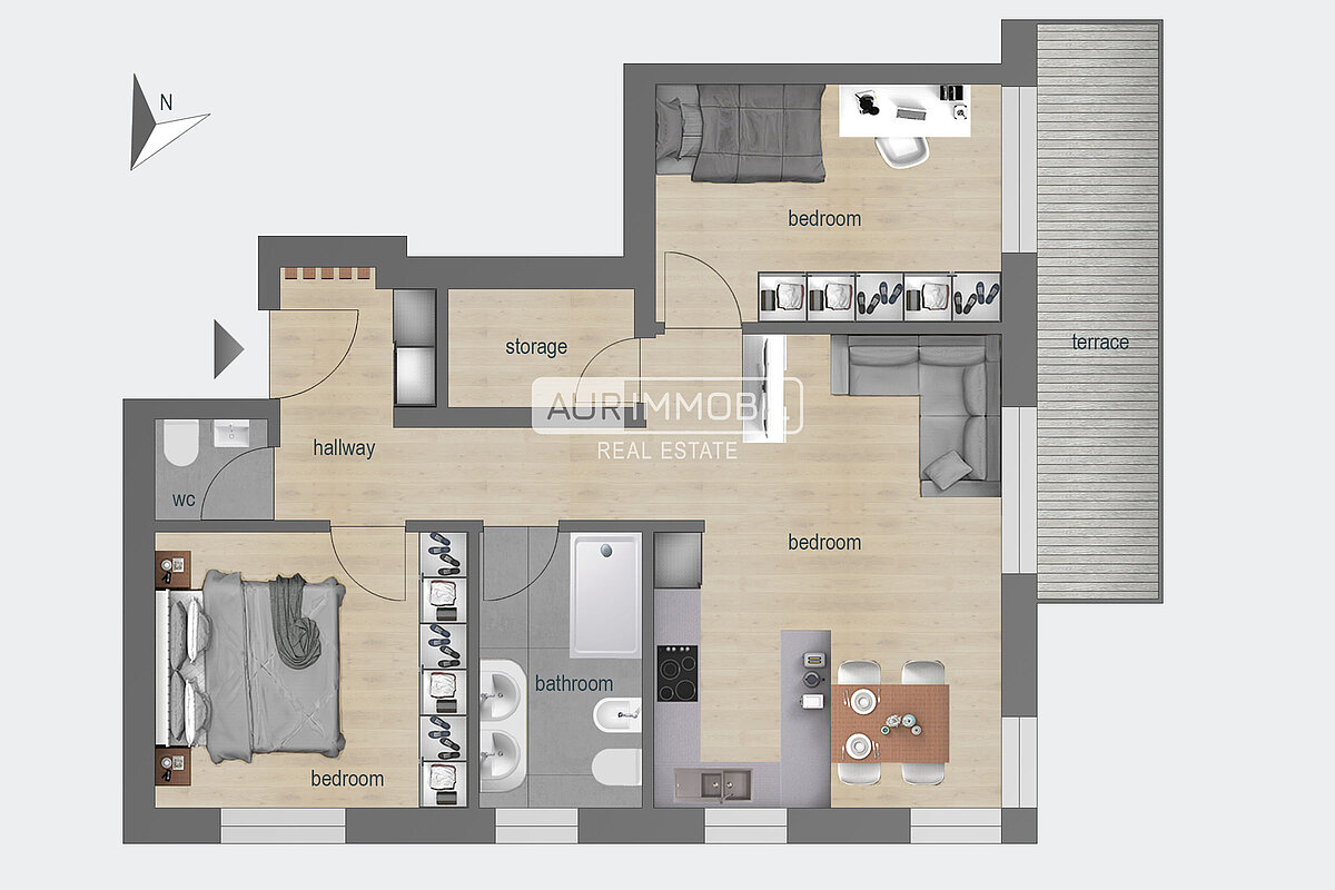 Die Wohnung besteht aus einem komfortablen Eingangsbereich mit Abstellraum, zwei Schlafzimmern – einem Doppelzimmer und einem Einzelzimmer –, einem gemütlichen Wohnbereich mit Kochecke, einem Badezimmer mit Dusche, einem Gäste-WC und einer Terrasse.