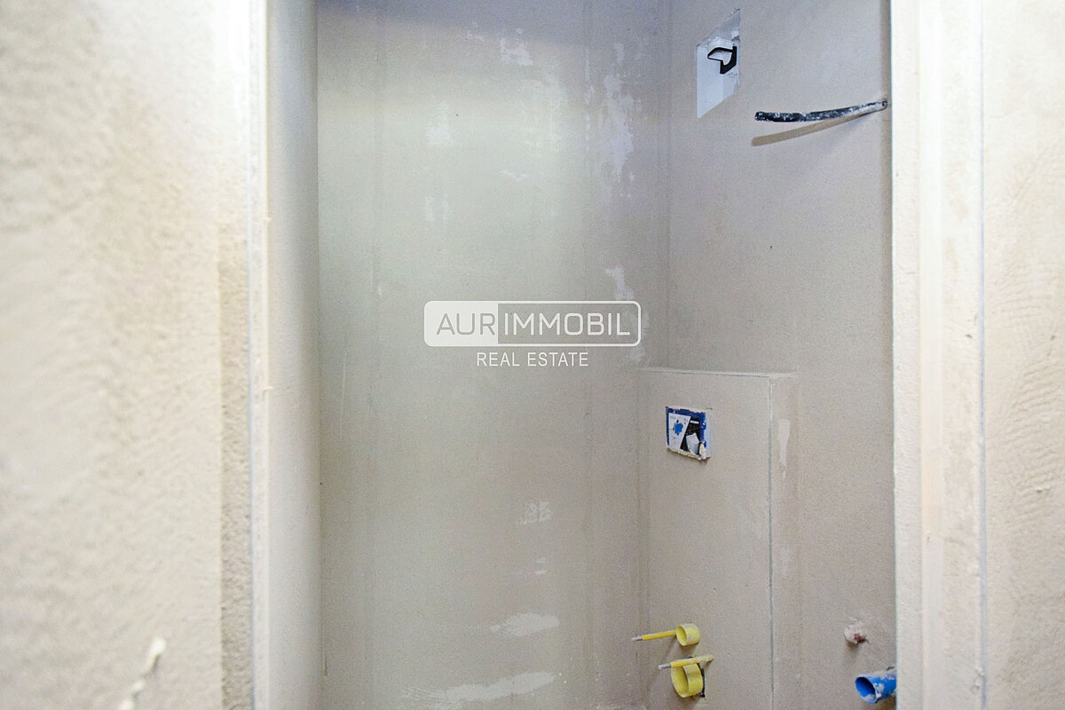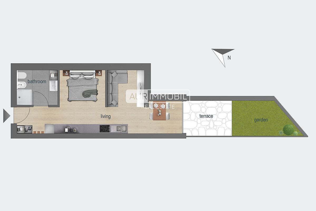 Diese Einzimmerwohnung befindet sich im Erdgeschoss und besteht aus einem Eingangsbereich, einem offenen Wohnraum mit Kochecke und Schlafbereich, einem Badezimmer und einer Terrasse mit privatem Garten.