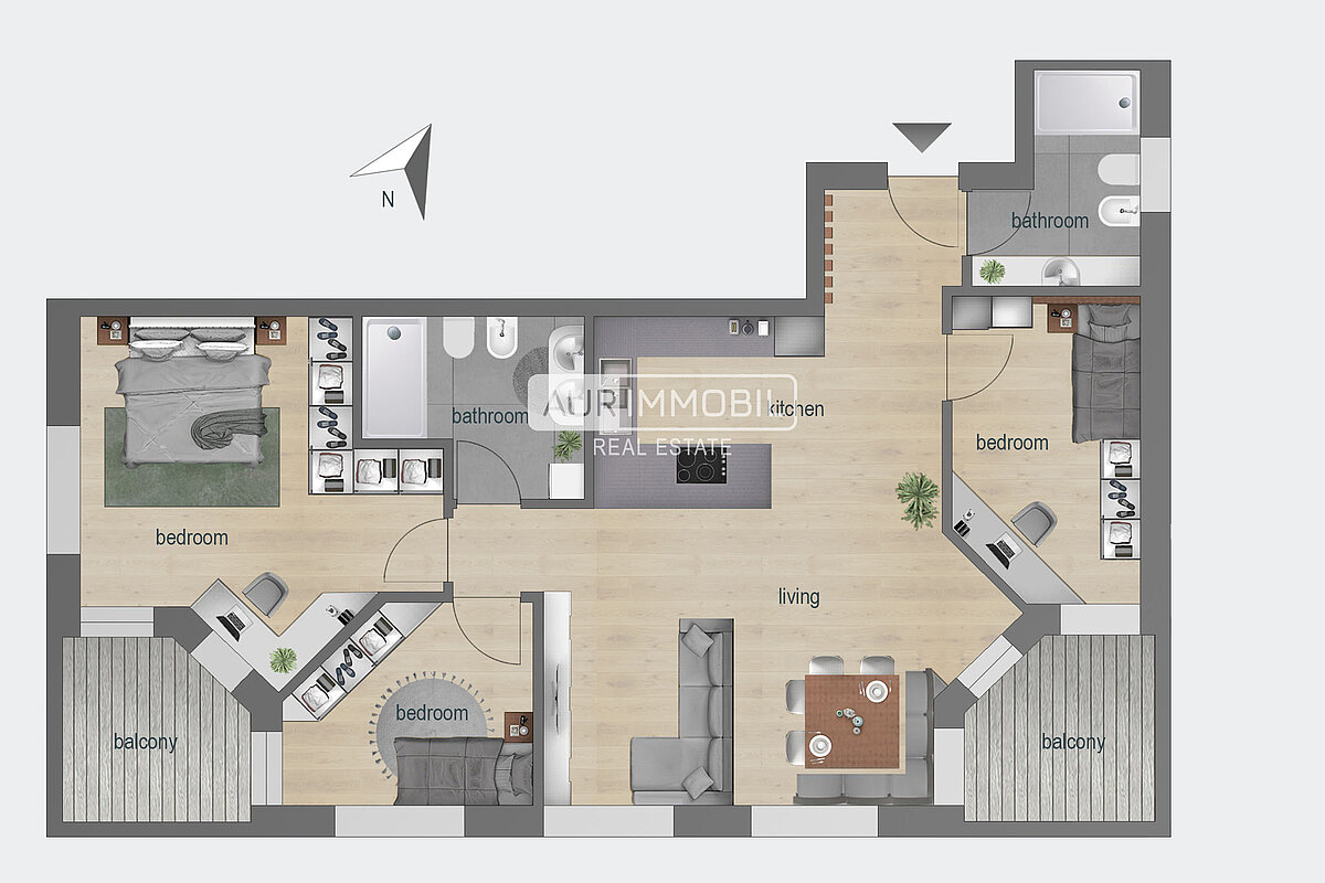 Diese Vierzimmerwohnung befindet sich im dritten Stock und besteht aus einem Eingangsbereich, einem lichtdurchfluteten Wohnraum mit Küche, drei Schlafzimmern, zwei Badezimmern und zwei Balkonen.