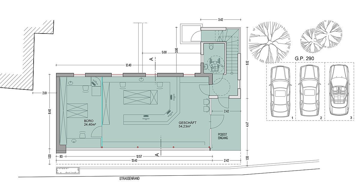 Dieses neuwertige Geschäftslokal liegt direkt an der Hauptstraße und ist durch die großen Schaufenster optimal sichtbar. Im Erdgeschoss befindet sich die große Geschäftsfläche und ein WC, während im Dachgeschoss eine Wohnung errichtet wurde. Im Untergeschoss verfügt die Immobilie über einen großen Keller.