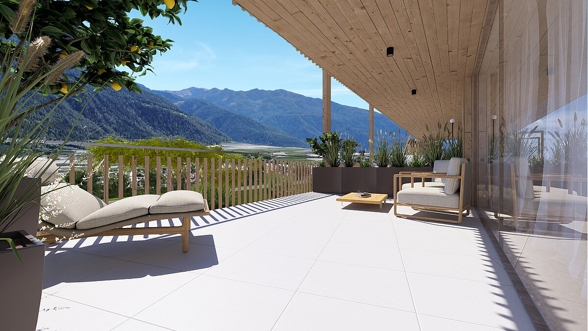 Wenn Architektur den Blick freigibt: Die Wohnung Panoramasuite B110 in der Wohnanlage Mondschein in Kastelbell ist eine Einladung an alle, die das Besondere suchen – mit großzügiger Terrasse, Südausrichtung, zwei Schlafzimmern und zwei eleganten Bädern. Hier wohnt man mit Aussicht – stilvoll, ruhig und durchdacht bis ins Detail.