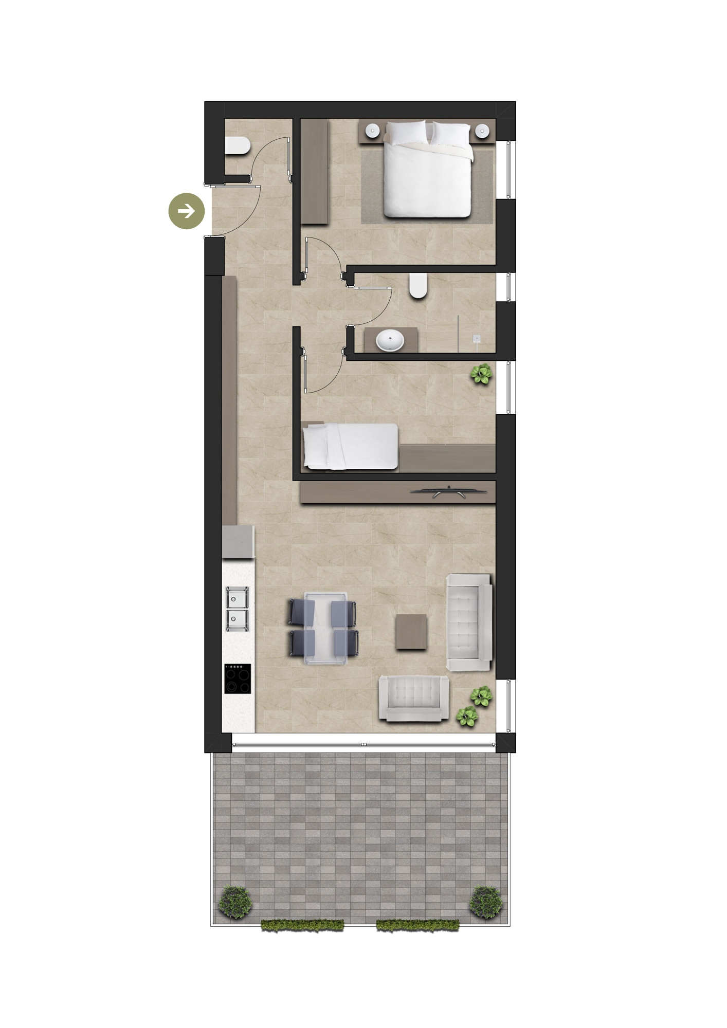 Die tief geschnittene Terrasse schafft Raum für echte Wohnqualität im Freien: teils sonnig, teils angenehm beschattet – ideal für entspannte Lesestunden, Outdoor-Dining oder ruhige Morgenrituale. Große Glasfronten holen die Natur ins Innere, ohne auf Privatsphäre zu verzichten. Und wie bei allen Einheiten: Die Gemeinschaftsfläche mit solarbetriebener Wasserzone rundet das Gesamtbild stimmig ab.