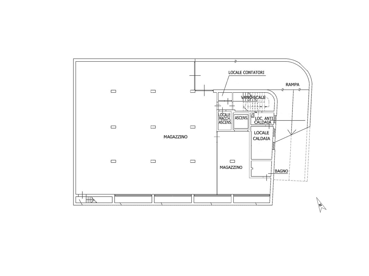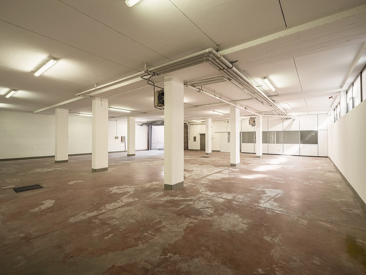 Untergeschoss (ca. 330 m² – h ca. 3,00 m): Lagerfläche mit 2 Toren und bequemer Zufahrt für Lieferfahrzeuge über eine separate Außenrampe.
