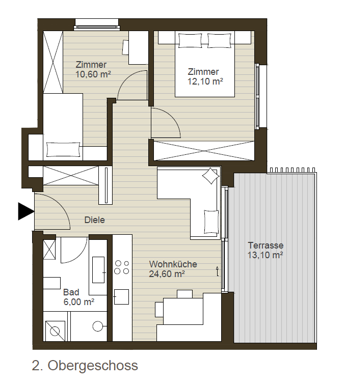 Der Wohnbereich ist offen gestaltet und verfügt über direkten Zugang zur Terrasse, wodurch ein heller und angenehmer Aufenthaltsraum entsteht. Die Wohnung bietet zwei Schlafzimmer, die flexibel nutzbar sind, sowie ein modern geplantes Badezimmer, das funktional in das Gesamtkonzept integriert ist.