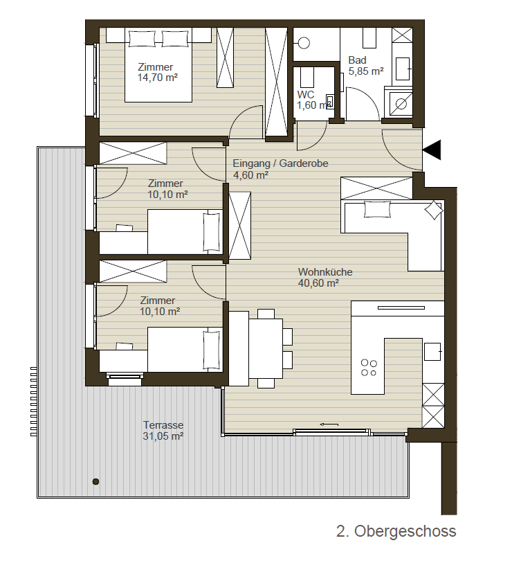 Die große Eckterrasse bildet das Herzstück der Wohnung und bietet vielfältige Nutzungsmöglichkeiten – ideal für entspannte Stunden im Freien oder geselliges Beisammensein.