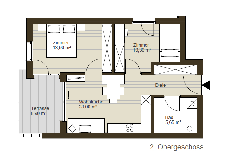 Der Wohnbereich ist offen gestaltet und verfügt über direkten Zugang zur Terrasse, wodurch ein heller und angenehmer Wohnraum entsteht. Die Wohnung bietet zwei Schlafzimmer, von denen eines ebenfalls einen direkten Terrassenzugang hat und sich ideal als ruhiger Rückzugsort eignet. Das Badezimmer ist funktional und zeitlos geplant.