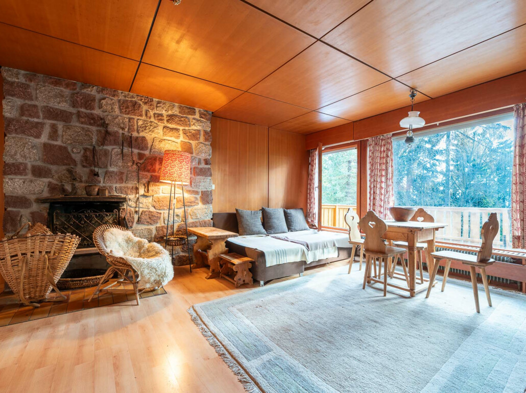 Der Wohnbereich bildet das Herzstück des Hauses: Ein stilvoller Kamin sorgt für eine besonders gemütliche Stimmung und macht den Raum zum idealen Treffpunkt für Familie und Gäste. Große Fensterflächen öffnen den Blick auf die umliegende Landschaft und verbinden den Innenraum harmonisch mit der Natur. Die angrenzende Terrasse lädt dazu ein, sonnige Tage und laue Sommerabende in absoluter Privatsphäre zu genießen.
