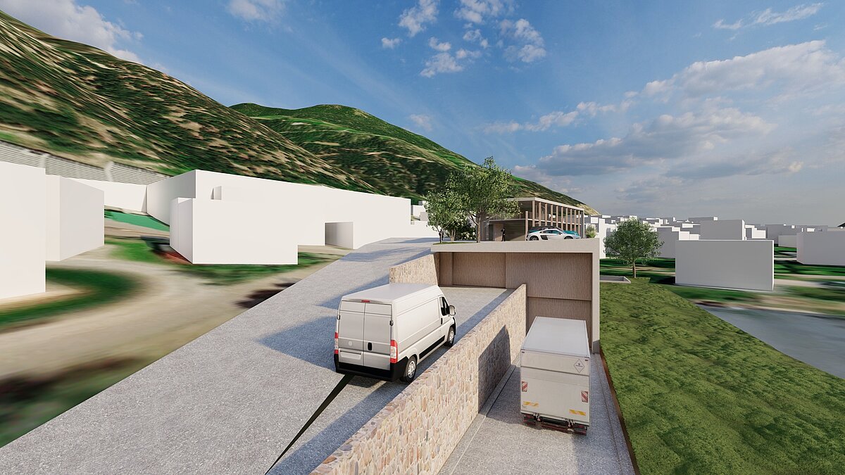 Das Projekt sieht vor zwei zum Teil unterirdische Lagerhallen zu errichten, welche jeweils über eine Rampe auf der Westseite erschlossen werden.