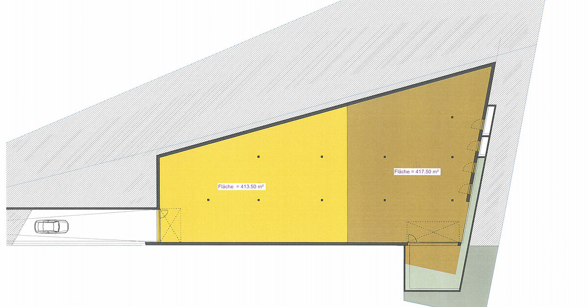 Die Halle im 2. Untergeschoss ist über eine eigene Rampe mit nur 4,5% Neigung erreichbar und hat eine Höhe von 4m.