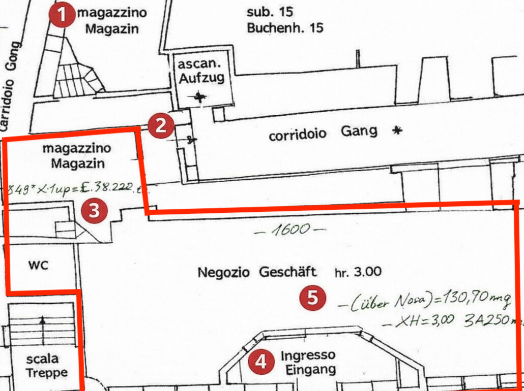 Das Geschäft befindet sich in zentraler und stark frequentierter Lage am Sandplatz, einem der bekanntesten Plätze in Meran. Die Umgebung zeichnet sich durch eine hohe Passantenfrequenz, zahlreiche Geschäfte, Cafés und Dienstleistungsbetriebe aus.