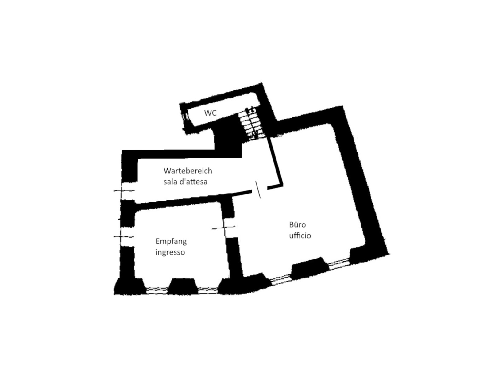 Die helle Einheit besteht aus Eingangsbereich/ Rezeption, Büro/ Besprechungsraum mit einer Ecke für die Kaffeepause, WC, und einem Wartesaal, der auch als Archiv genutzt werden kann.
