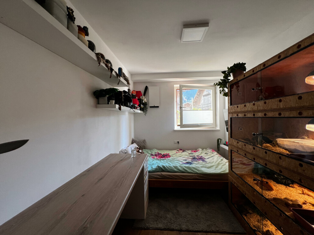 Die Wohnung verfügt über eine Nettofläche von rund 110 m² und ist über einen Aufzug bequem erreichbar. Die Raumaufteilung ist ideal durchdacht: ein großzügiger Wohnraum mit Küche, drei Schlafzimmer, ein Badezimmer mit Fenster, ein separates Tages-WC, ein kleines Büro sowie eine praktische Speisekammer.