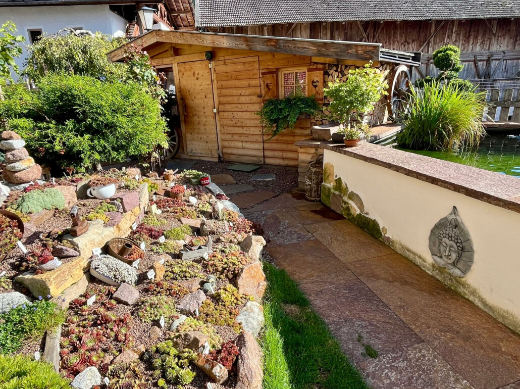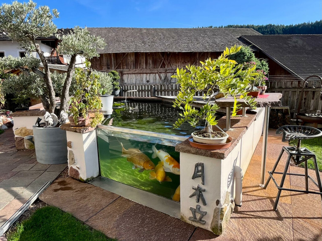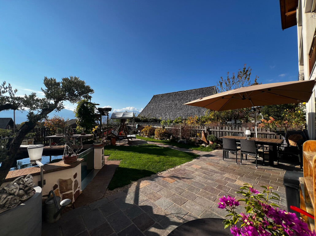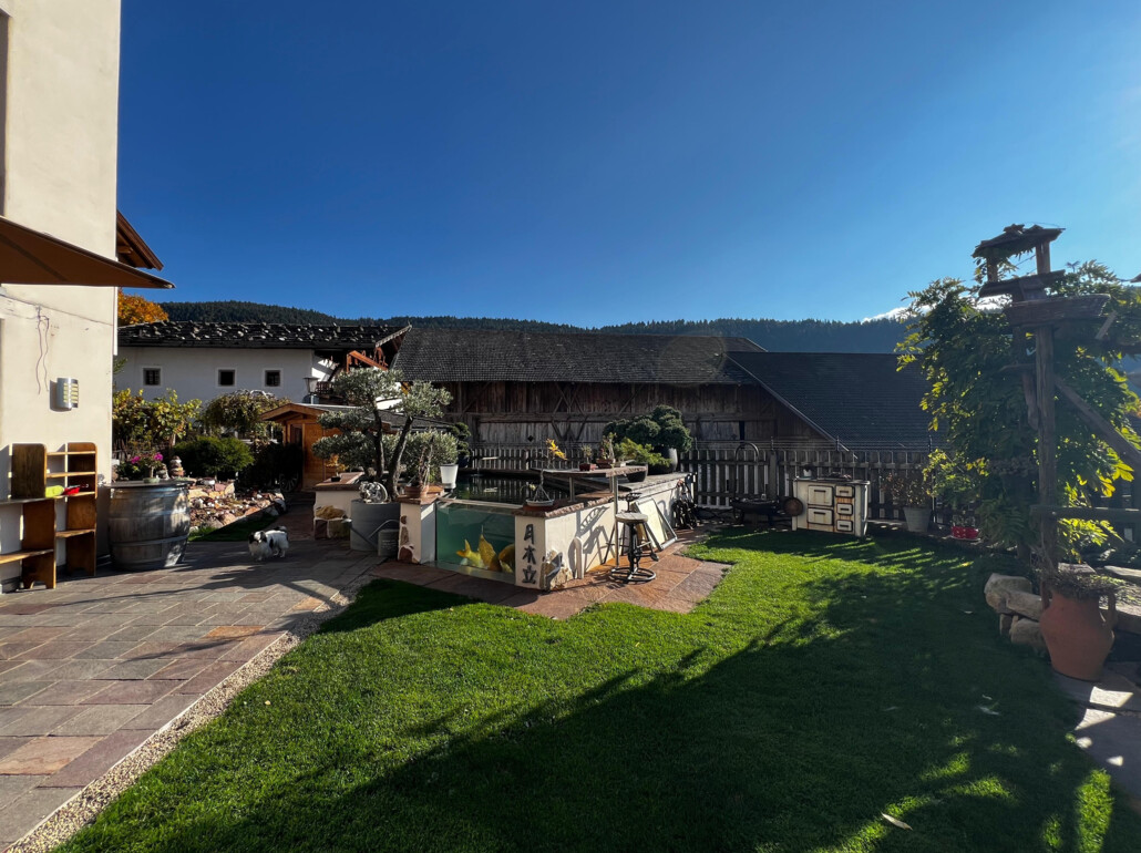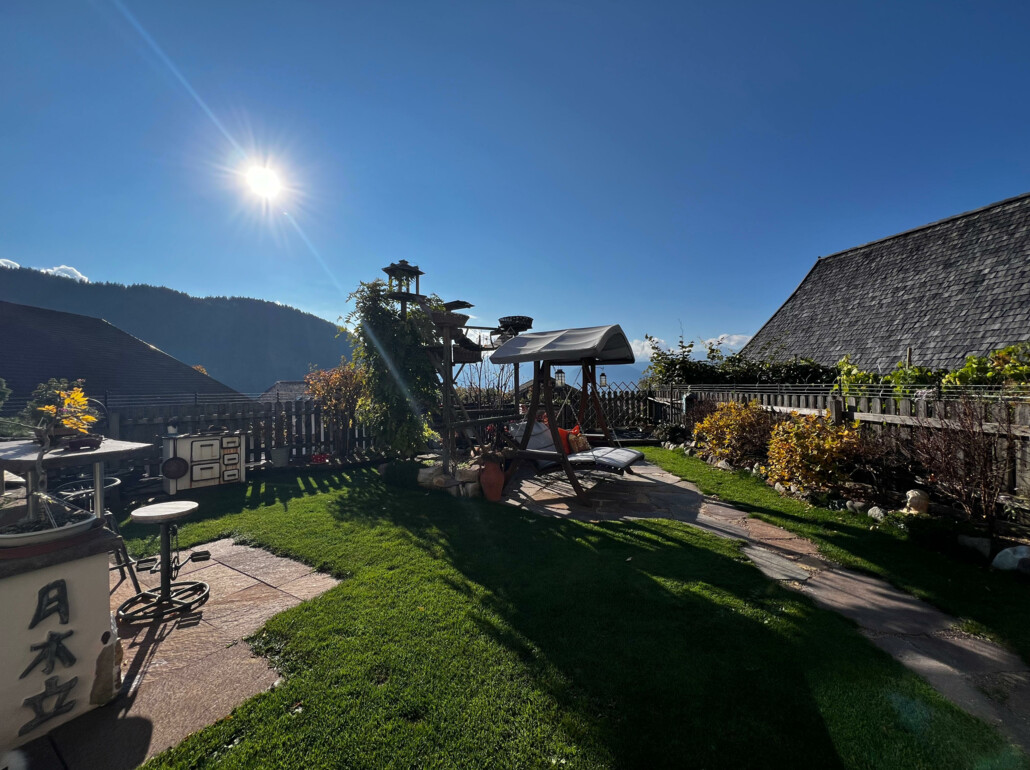 Besonders hervorzuheben ist der große Garten von ca. 250 m², der mit einem liebevoll angelegten Natur-Schwimmteich samt fünf Japan-Kois ausgestattet ist – ein besonderer Rückzugsort zum Entspannen und Abkühlen an heißen Sommertagen. Die Terrasse ist nach Südosten ausgerichtet und bietet einen herrlichen Weitblick auf die Laugenspitze. Durch die Lage profitiert man das ganze Jahr über von viel Sonne und absoluter Ruhe.