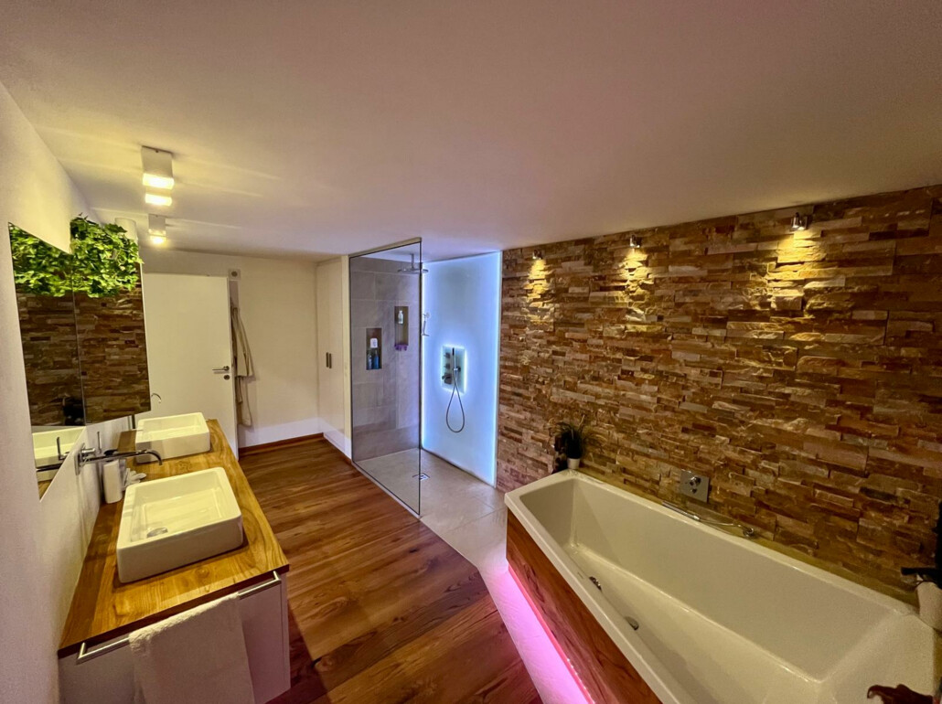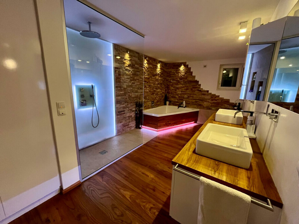 Die Ausstattung der Wohnung ist äußerst hochwertig: eine Smart-Home-Haussteuerung mit integrierter Musikanlage, eine Staubsaugeranlage, ein Regenwassertank mit automatischer Bewässerung und Regensensor, eine Entkalkungsanlage für das gesamte Haus, Insektenschutzgitter in allen Fenstern und Türen sowie eine Wärmerückgewinnungsanlage zur kontrollierten Belüftung wurden eingebaut. Beheizt wird die Wohnung mittels Pelletsheizung über Fußbodenheizung in allen Räumen.