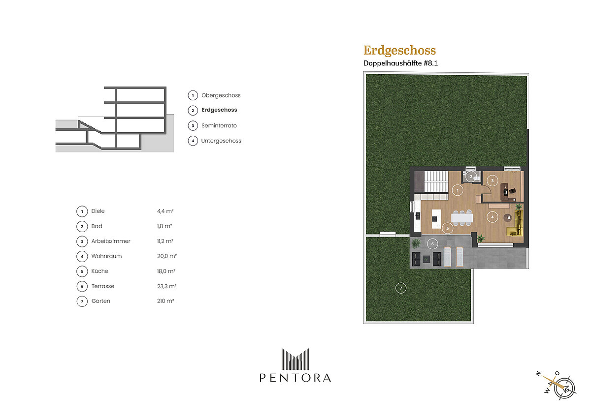 Die terrassenförmige Anordnung auf verschiedenen Höhenniveaus sorgt für maximale Privatsphäre. Die ideale Süd-westausrichtung lässt die Räume im natürlichen Licht erstrahlen und schafft eine helle, einladende Atmosphäre. Hier trifft durchdachte Architektur auf zeitloses Design, umgeben von einer sehr ruhigen Umgebung.