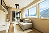 Hohe Panoramafenster schaffen lichtdurchflutete Räume und bieten einzigartige Ausblicke auf die Dächer der Stadt, den umgebenden Park und die Berge.