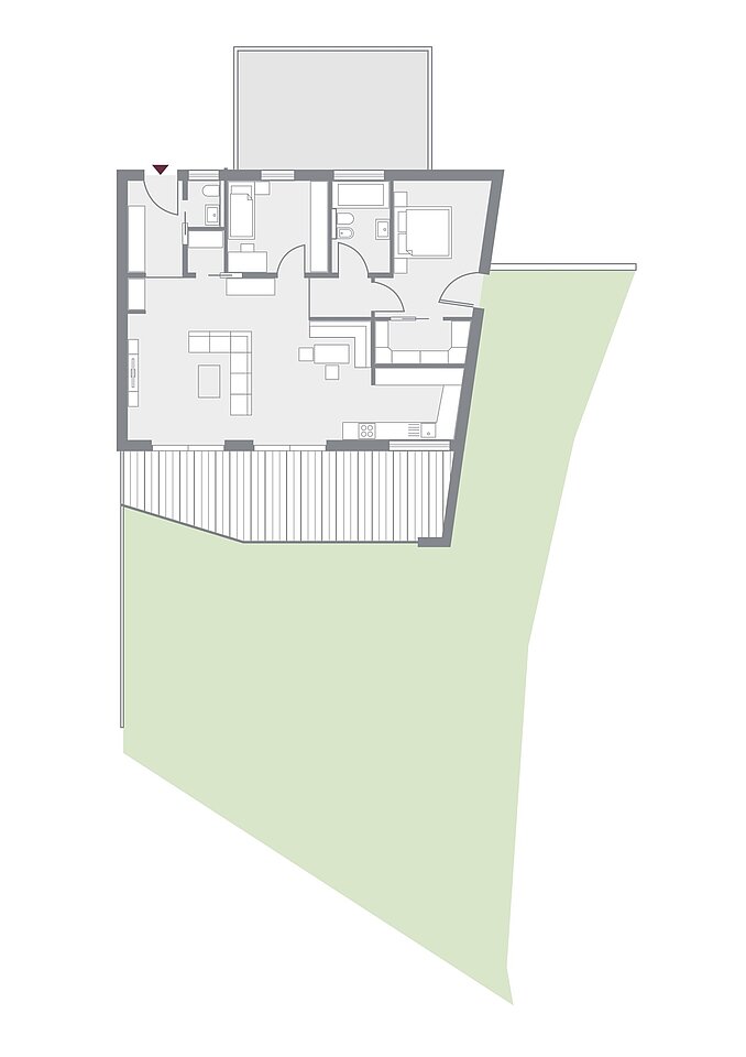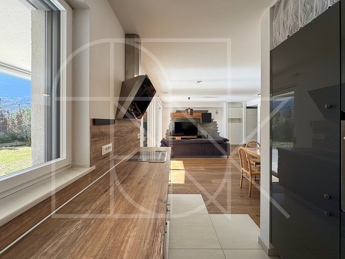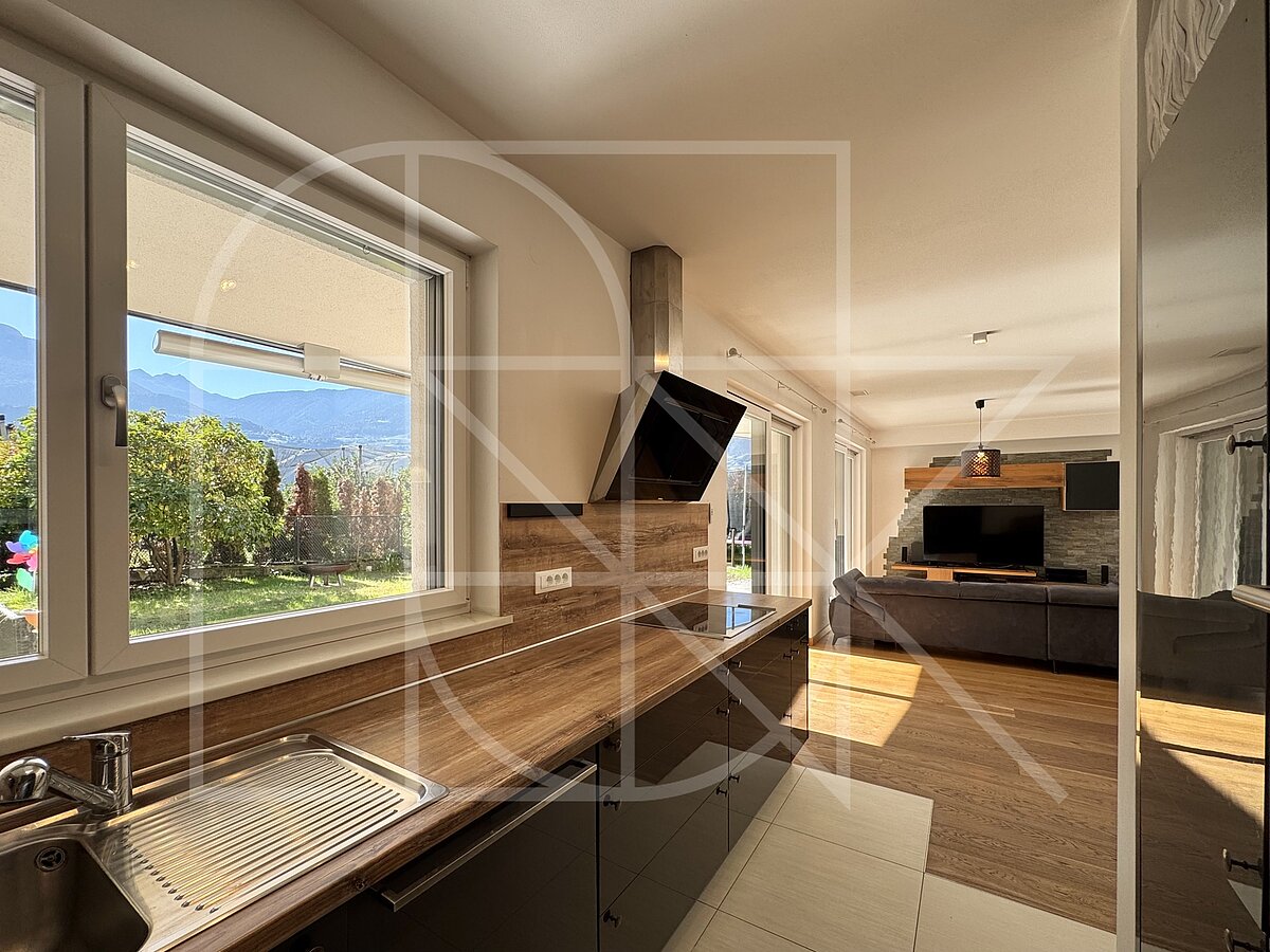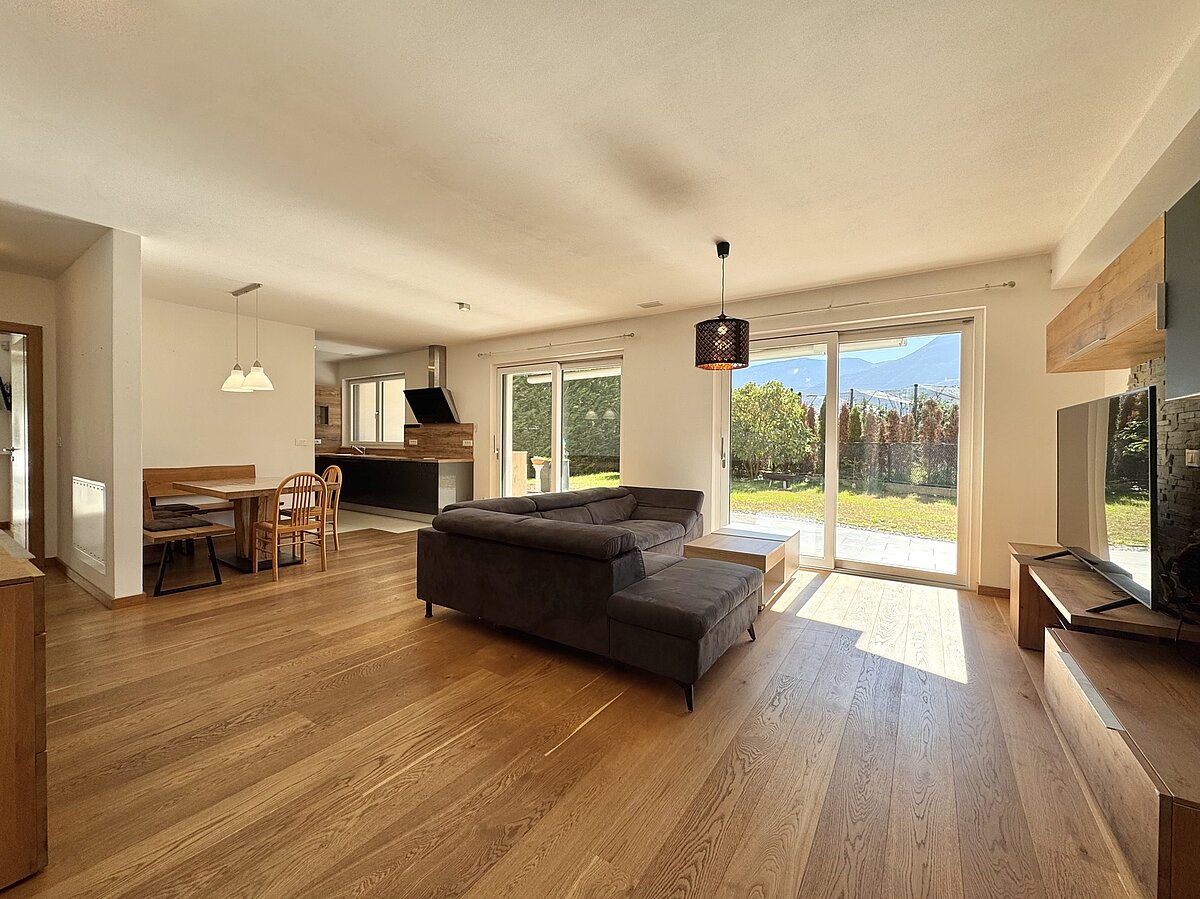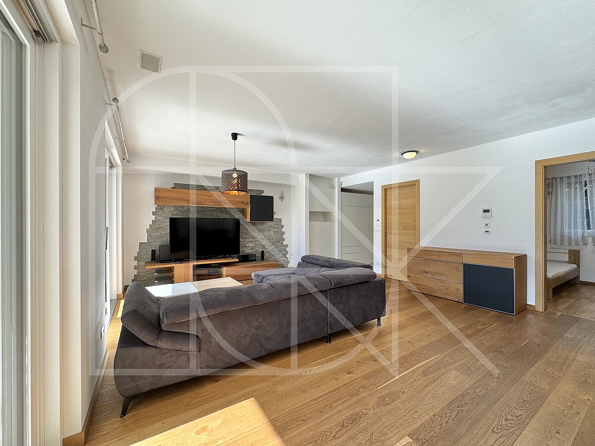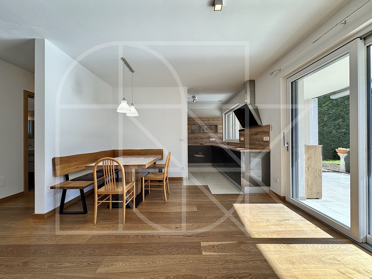 Das Herzstück der Wohnung ist zweifellos der sehr helle und großzügige Wohnbereich mit offener und qualitativer Einbauküche. Der elegante Vollholzfußboden, sorgt im Wohnzimmer für eine besonders warme und behagliche Atmosphäre.