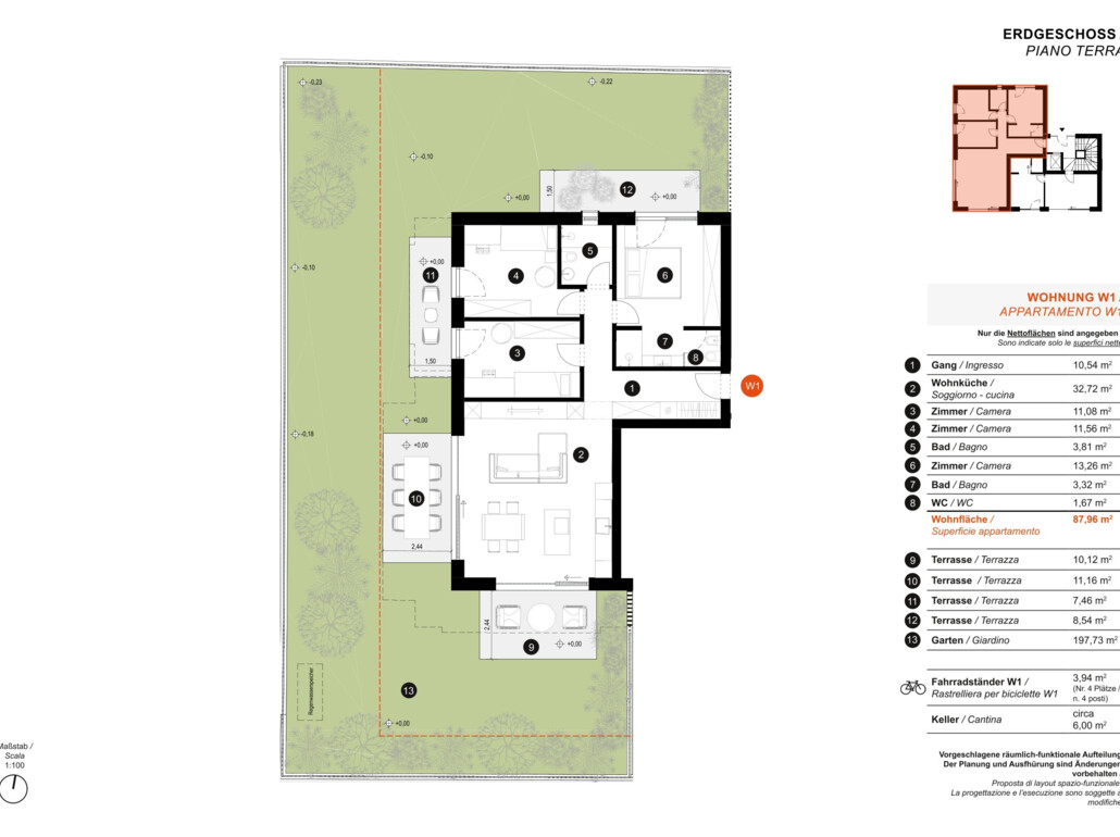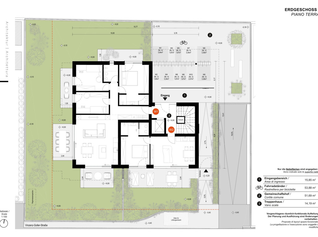 W1: Die Wohnung befindet sich im Erdgeschoss und ist wie folgt eingeteilt: Eingangsbereich, Wohnraum mit Küche, 3 Schlafzimmer, 2 Badezimmer, Terrasse und Privatgarten.