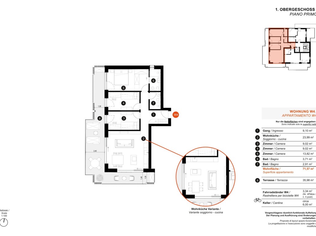 W4: Die Wohnung befindet sich im 1. Stock und ist wie folgt eingeteilt: Eingangsbereich, Wohnraum mit Küche, 3 Schlafzimmer, 2 Badezimmer und Terrasse.