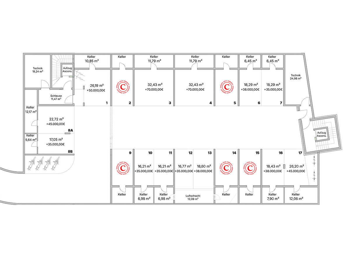 Zudem steht ein privater Keller zur Verfügung, der bequem über den Personenaufzug von allen Etagen aus erreichbar ist.