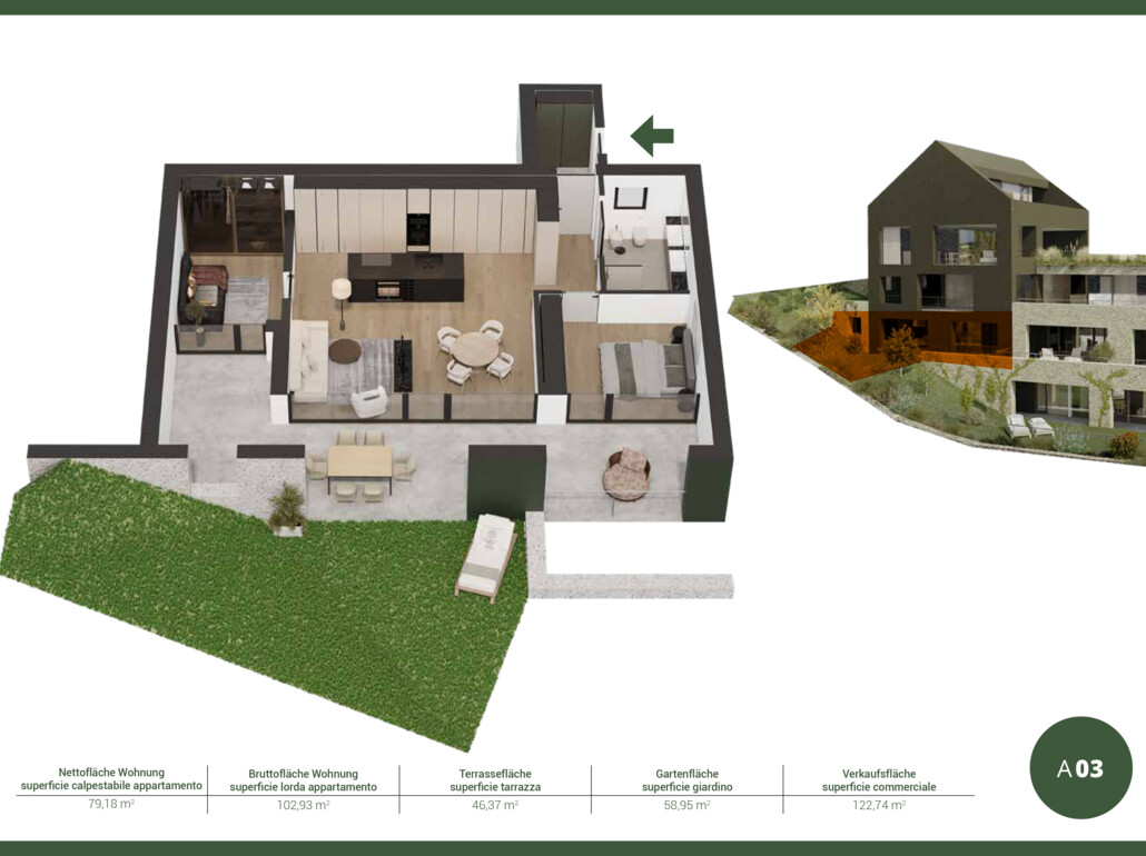 WA03: Zum Verkauf steht eine neue 3-Raum-Wohnung mit großer Terrasse und großem Privatgarten. Interne Einteilung: Eingang, Wohnraum mit Küche, Schlafzimmer, Studio, Badezimmer, Terrasse und Privatgarten.