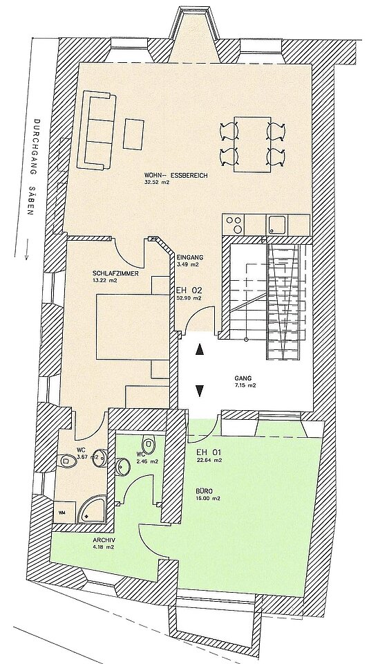 Das Wohn-Geschäftshaus besteht aus einem Geschäftslokal im Erd- und Untergeschoss, einer Wohnung und Studio im 1. Stock, zwei Wohnungen im 2. Stock und zwei als B & B genützt Einheiten im Dachgeschoss .