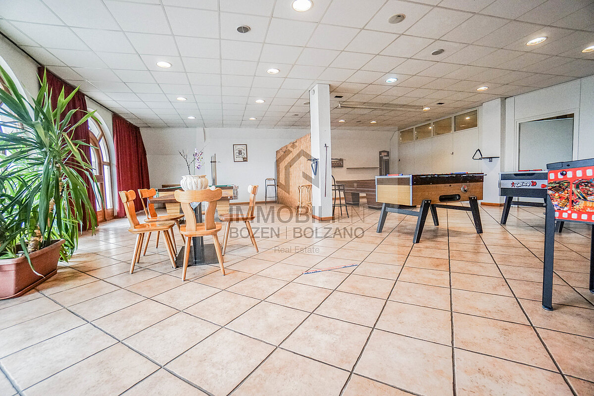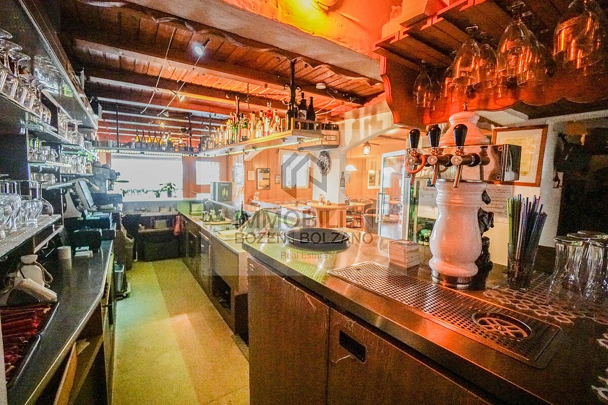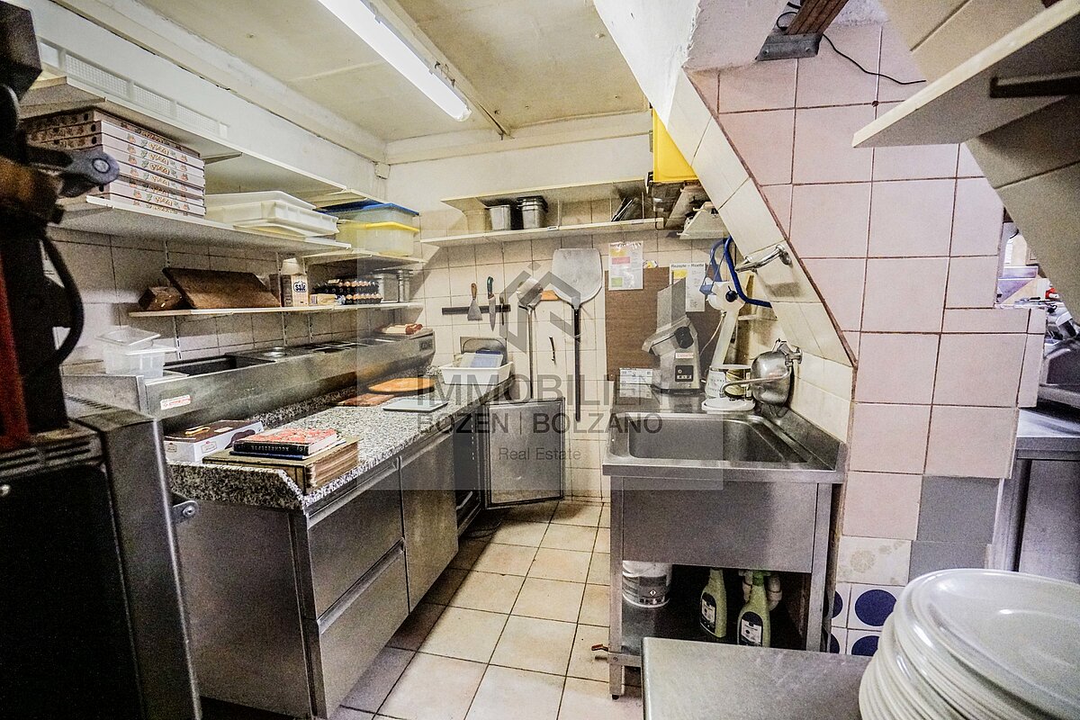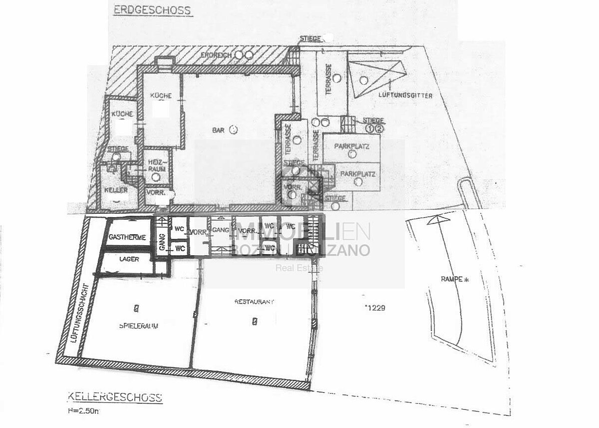 Das Restaurant befindet sich im Erdgeschoss una hat eine Fläche von ca. 410 m². Es besteht aus einem Terassenbereich, einer Bartheke, einem großen Speisesaal mit ca. 150 Sitzplätzen, einer Küche, einem Pizzaofen und mehreren WC’s. Zudem gehört auch eine Tiefgarage mit ca. 573 m² dazu. In dieser befindet sich ca. 17 Parkplätze.