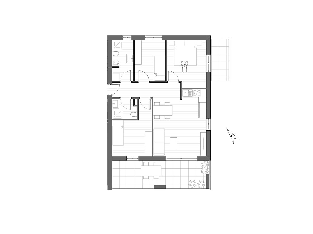 Diese attraktive Wohnung im ersten Obergeschoss eines modernen Neubaus in Meran überzeugt durch ihre helle Atmosphäre und eine durchdachte Raumaufteilung. Der großzügige Wohnbereich mit offener Küche bietet direkten Zugang zu einem großen Balkon, der ausreichend Platz für gemütliche Stunden im Freien bietet. Drei Schlafzimmer sowie zwei Bäder – eines mit Fenster und Dusche, das andere als praktisches Gäste-Bad – sorgen für hohen Wohnkomfort. Ein weiterer Balkon erweitert den privaten Außenbereich und unterstreicht das Gefühl von Offenheit und Leichtigkeit. Dank der großen Fensterfronten ist die Wohnung lichtdurchflutet und vermittelt ein modernes, einladendes Wohngefühl. Die Immobilie befindet sich in zentrumsnaher und krankenhausnaher Lage mit guter Anbindung an öffentliche Verkehrsmittel und Einkaufsmöglichkeiten. Der Neubau wurde nach dem Standard eines Klimahauses A Nature errichtet. Garagen sind gegen Aufpreis erhältlich, und da es sich um einen Neubau handelt, können persönliche Wünsche bei der Innenausstattung berücksichtigt und das Innere individuell gestaltet werden.