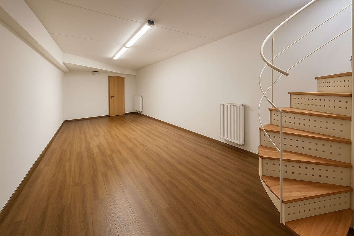 Die Räumlichkeiten im Erdgeschoss sind hell und lichtdurchflutet, wodurch ein angenehmes und produktives Arbeitsumfeld geschaffen wird. Über eine interne Treppe, oder bequem von außen mit einem Aufzug, gelangt man in das Untergeschoss, wo sich ein weiterer Raum und ein WC befinden. Mit einer Wendeltreppe werden die Büroräume mit einem praktischen Archivraum direkt verbunden.
