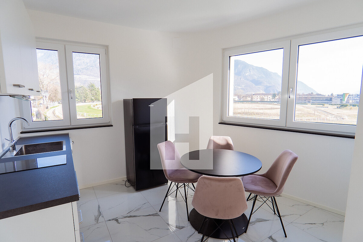 Zu vermieten ist eine voll möblierte Zweizimmerwohnung in Meran, gelegen in einem Neubau mit nur 6 Einheiten. Die Erstbezugswohnung überzeugt durch ihre ruhige Lage am Ende einer Sackgasse, ihre südliche Ausrichtung, eine ca. 11 m² große Terrasse mit direktem Blick auf die Pferderennbahn sowie einen Garagenstellplatz.
